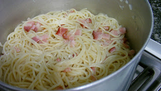 Escorra o macarrão e misture o bacon/cebola/água com ele. O fogo deve permanecer ligado durante todo o processo.