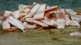 Quando o macarrão estiver cozido frite a cebola e o bacon juntos no azeite.