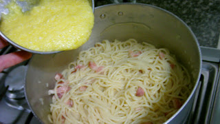 Próximo passo é adicionar a mistura de ovos e queijo ralado.